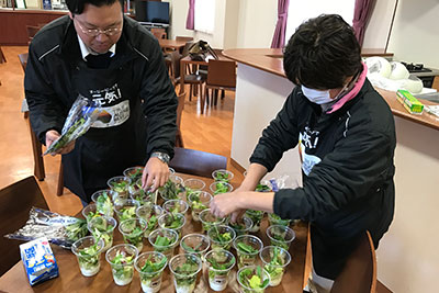 ステーキカップの土台となるマッシュポテト・お野菜の盛り付け中です!
