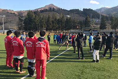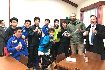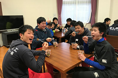 グラウンドでは釜石高校と釜石商工高校のラグビー部員達と、